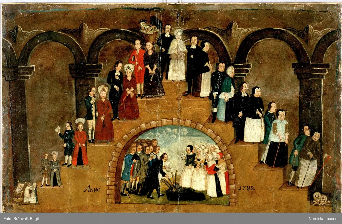 Väggbonad, målad 1782 av Carl H Ehrenberg (1728-1801). Framställer människans olika åldrar, nederst jordfästning. Nordiska museets föremål inv.nr 11954.