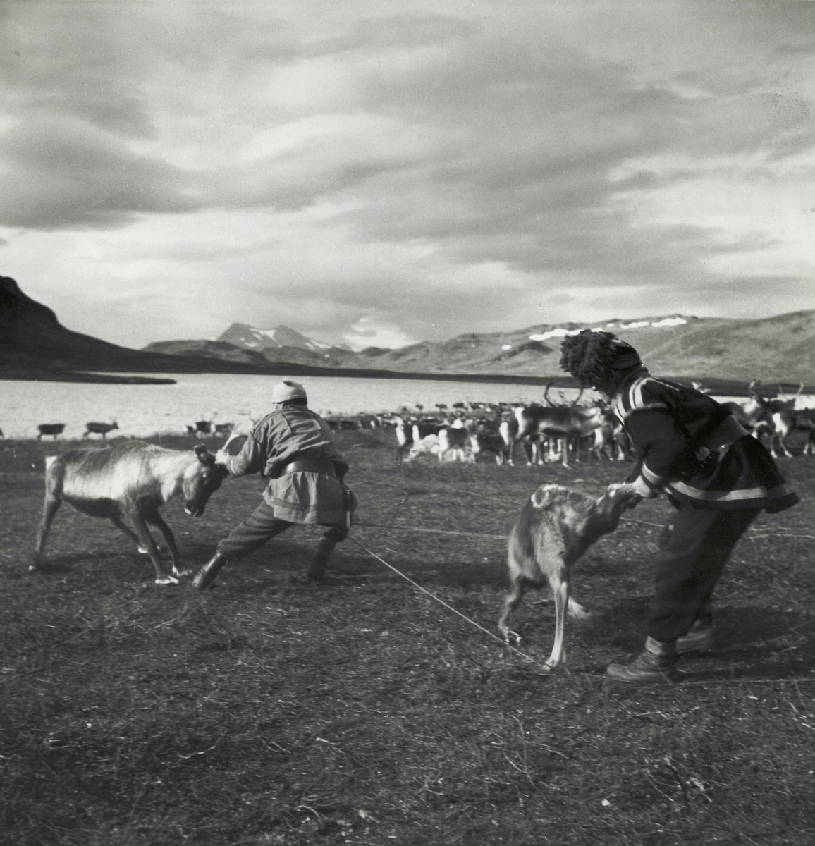 • Renskiljning. Två samer skiljer renar ur en hjord vid vatten. I bakgrunden fjäll.