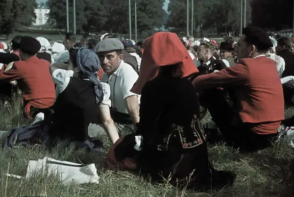 Publik iklädda folkdräkt sitter i gräset. Utländska folkdräkter.