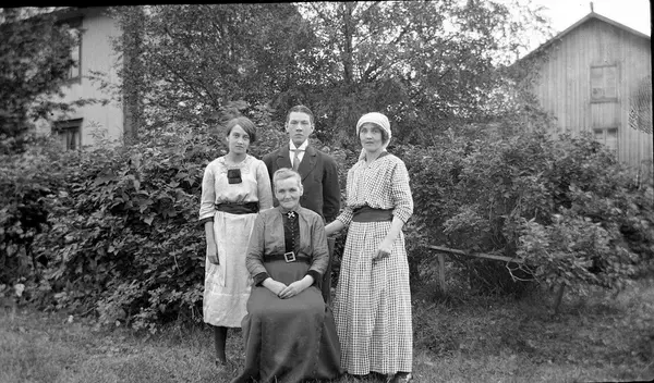Grupporträtt i trädgård. Sittande äldre kvinna, två stående yngre kvinnor samt yngre man. Tärnsjö, Dalarna. "Del av familjen Staffansson, Östra Långstrand. Stående fr.v. Valborg Staffansson (1901-1996), Sigurd Staffansson (1895-1954), Ellen Staffansson (1893-1983) och deras mor Elisabet Staffansson (1860-1944)." Källa: Olle Tranberg - 21.03.2017 kl. 17:16, via Digitalt Museum