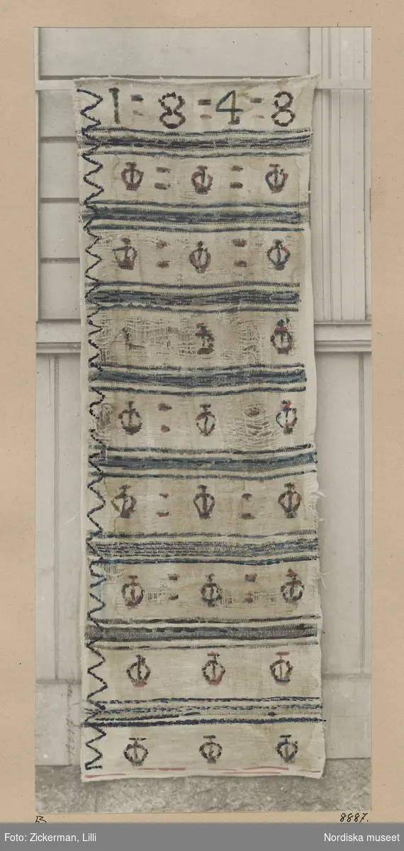 • Täcke av tygtrasor."Slarvtjäll" Warp. Linne. Inslag: trasor. Mönstergarn: trasor. Svartvitt handkolorerat foto. Från Hälsingland, Alfta socken. Kat.nr. 8887