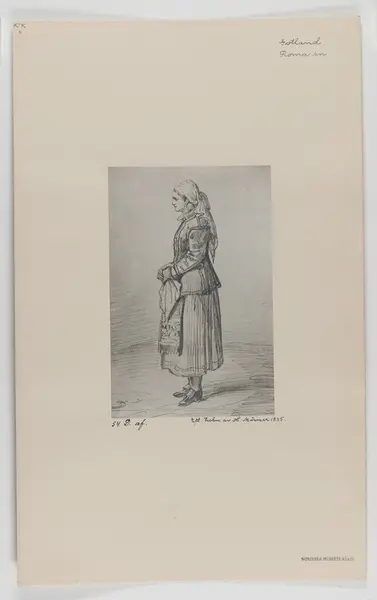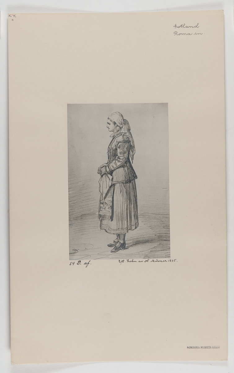 • Kvinna i folkdräkt, i helfigur i profil. Gotland, Roma socken. Efter blyertsteckning av Hj. Mörner 1835.