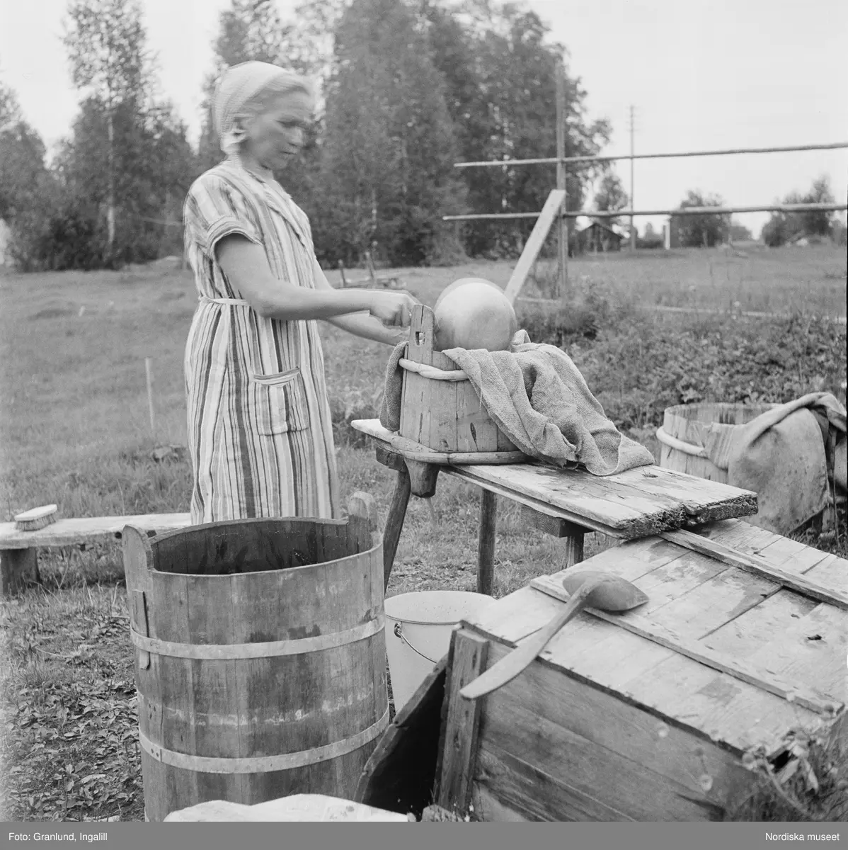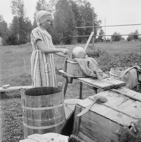 Ölbryggning, mäsken silas. I tunnsilen lägges över trästickorna en silduk och så hälles mäsken i och sötan rinner ur. Gruddbo by, Sollerö socken i Dalarna.