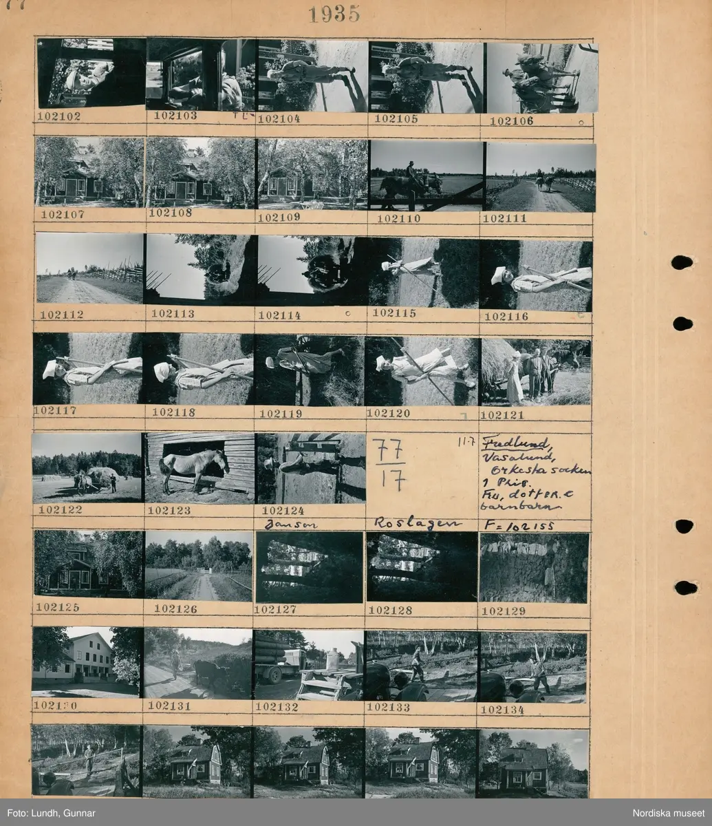 Motiv: Janson (Kragsta - Björklund) - flicka 115, 1 Pris; Porträtt av en man vid en bildörr, porträtt av en man, en man rider på en häst, exteriör av hus, en man kör ett hästdraget hölass, porträtt av en kvinna som räfsar hö, porträtt av en kvinna och två mäns som står framför ett hästdraget hölass, en häst vid ett stall, porträtt av en man "Janson". Motiv: Fredlund, Vasalund, Orkesta socken 1 Pris. Fru, dotter & barnbarn; Exteriör av ett hus, landskapsvy med väg och grind, landskapsvy i skogen Roslagen, en stenmur F=102155, exteriör av en byggnad, en kvinna föser en ko på en väg, en lastbil med timmerstockar kör förbi en mjölkpall med en mjölkkanna, ett barn bär en stör, exteriör av ett hus.