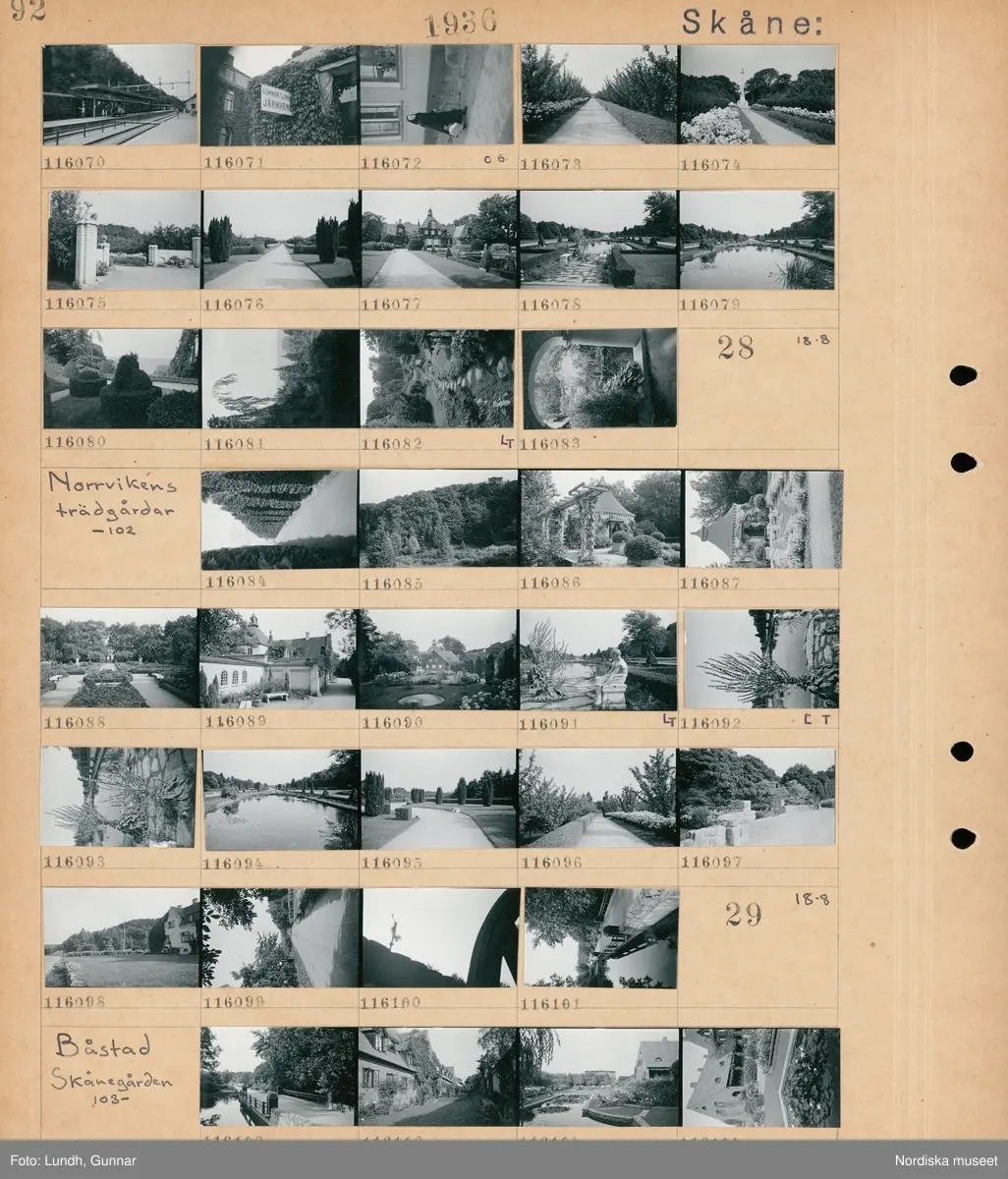 Motiv: Skåne, Kullen, Kattarp -69, Båstad, Norrvikens trädgårdar 73- ; Vy över perronger på en järnvägsstation, en skylt "Gunnar Lunds Järnhandel", en kvinna går på en trottoar, vy över en park med planteringar, exteriör av en byggnad, en park med en damm. Motiv: Skåne, Norrvikens trädgårdar -102 ; Vy över en skog, exteriör av en byggnad, vy över en park, en damm, en vindflöjel, en kanal. Motiv: Skåne, Båstad, Skånegården 103- ; En bro över en kanal, gatuvy med hus, vy över en park, exteriör av ett hus.