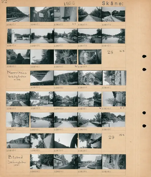 Motiv: Skåne, Kullen, Kattarp -69, Båstad, Norrvikens trädgårdar 73- ; Vy över perronger på en järnvägsstation, en skylt "Gunnar Lunds Järnhandel", en kvinna går på en trottoar, vy över en park med planteringar, exteriör av en byggnad, en park med en damm. Motiv: Skåne, Norrvikens trädgårdar -102 ; Vy över en skog, exteriör av en byggnad, vy över en park, en damm, en vindflöjel, en kanal. Motiv:...