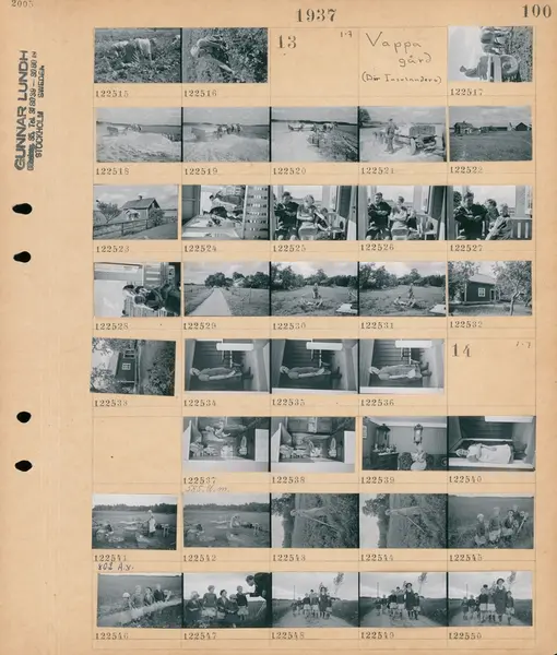 Motiv: Ultuna gård; Två barn arbetar med växter på en åker, en kvinna arbetar med växter på en åker. Motiv: Vappa gård (Direktör Insulanders) ; Två män skyfflar något vitt material upp på en hästdragen vagn, vy över en bondgård, en man och en kvinna och ett barn sitter på en förstukvist, exteriör av ett hus, porträtt av en kvinna som håller en sopskyffel. Motiv: (ingen anteckning) ; Interiör av ett kök med en kvinna som håller en katt, interiör med en kvinna som sitter i en soffa och läser en tidning, porträtt av en kvinna, en kvinna tättar med tvättbräda, en kvinna arbetar på en åker, porträtt av en grupp barn, en man talar till en grupp barn, två kvinnor går med en grupp barn på en väg.