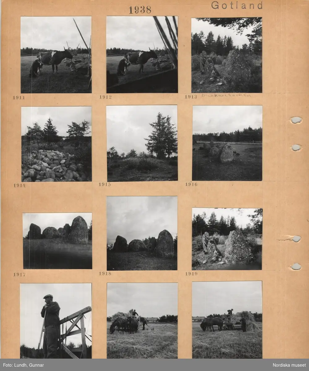 - Motiv: Gotland, en kvinna mjölkar en ko i en hage, gärdesgård av sten och trä, stensättning med resta större stenar, Dickkavebacken, med höga träd runt, stenröse, gärdesgård av trä, man i arbetskläder lutar sig mot en högaffel, två män fyller en hästdragen skrinda med hö på ett slaget fält.