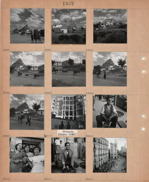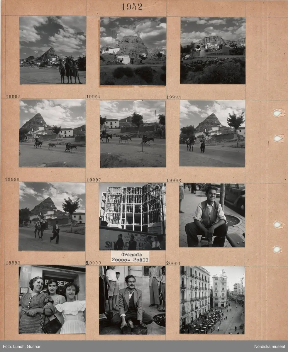 Motiv: (ingen anteckning) ; "Guadix Grottbostäder 19976 - 19999", porträtt av en grupp barn med bebyggelse och berg i bakgrunden, landskapsvy med bebyggelse och berg, en kvinna och en man rider på en åsna, en man leder en åsna, "Granada 20000 - 20011", ett husbygge, en man sitter på en pall, porträtt av tre kvinnor, en man med en skoputsarlåda, stadsvy med fotgängare och en uteservering.