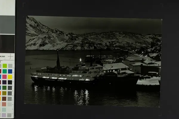 • Ett fartyg ligger för ankar i en hamn. Hurtigrutt M/S anlöper Honningsvåg, Nordkap, Norge mitt på dagen i december månad.