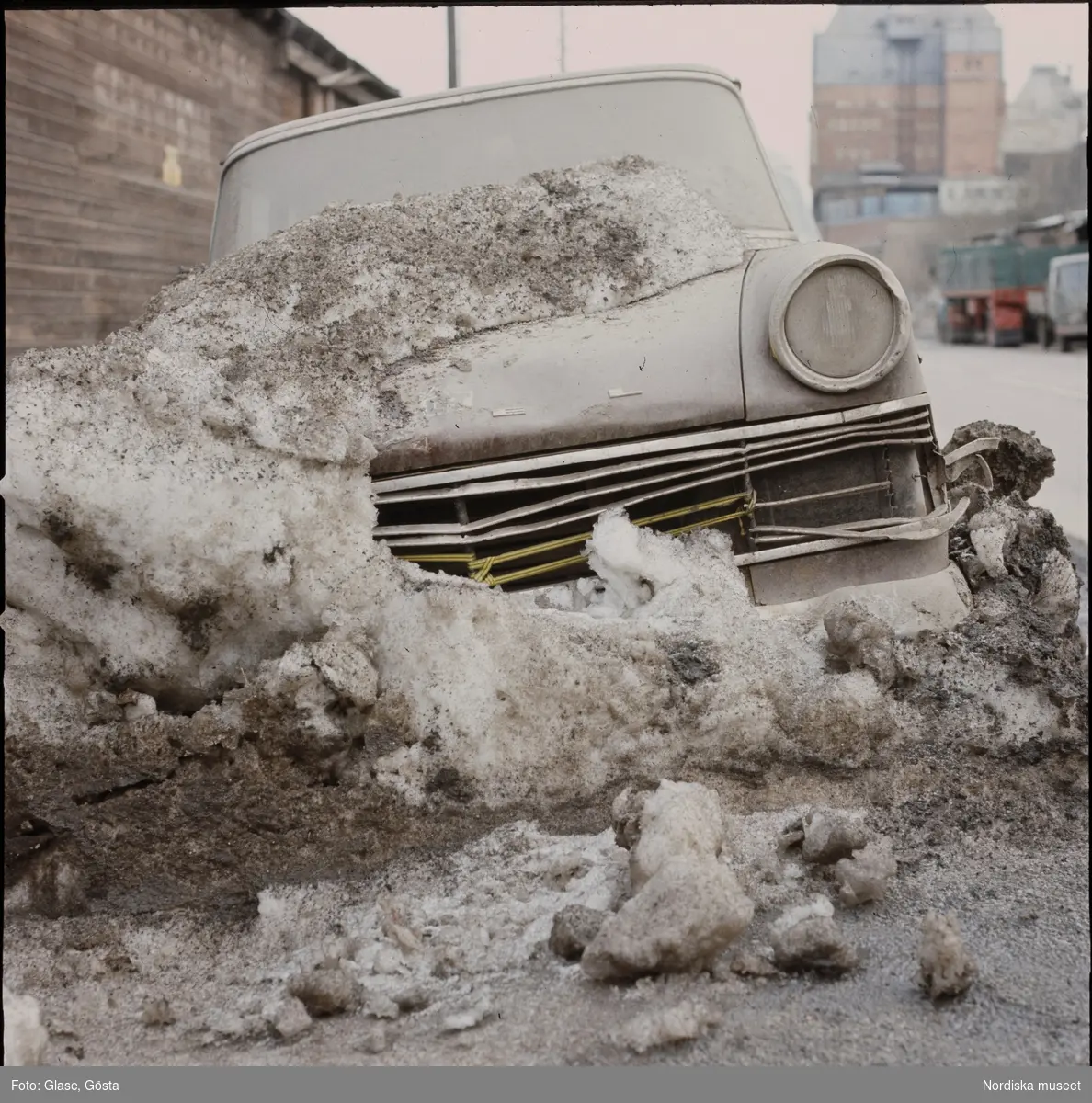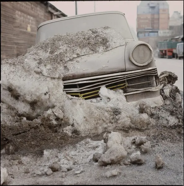 • Trasig, översnöad bil.