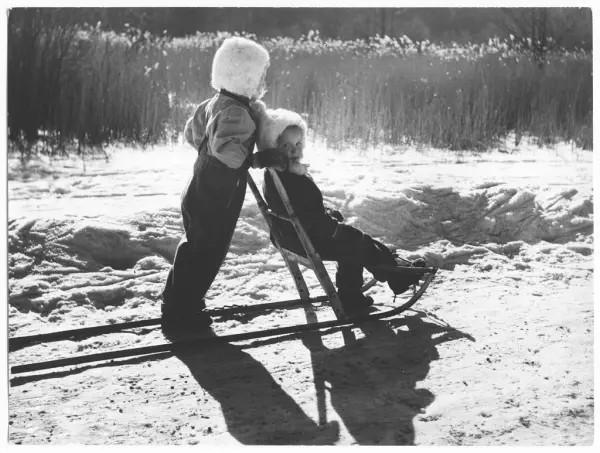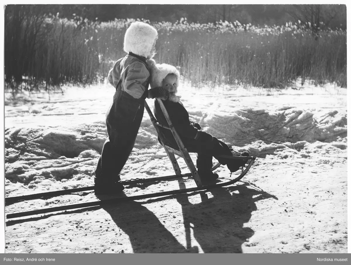 Två barn med en sparkstötting, lite av en nordisk specialitet. Detta kälkliknande transportredskap med långa stålmedar är enligt Nationalencyklopedin tidigast känt från de norrländska och nordfinska kustlandskapen, varifrån den från slutet av 1800-talet spreds söderut.