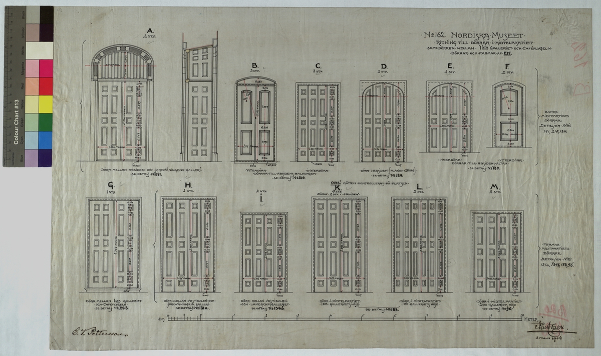 Ritning på väv över Nordiska museets huvudbyggnad. Ritning till dörrar i mittenpartiet samt dörren mellan första galleriet och caféflygeln. Dörrar och karmar av ek. Dörr mellan absiden och jordvåningens galleri. Ytterdörr. Innerdörr. Dörrar till Absidens balkonger. Dörr i absiden. Dörrar till absidens altan. Dörr mellan vestibulen och landskapsgalleriet. Dörr i mittenpartiet andra galleriets höjd. Fast inredning. Dörr, vikdörr. 42,5x67,5 cm. Tusch och rött. Linjalritning. I Gust Clason 2 mars 1904. C V Petterson.