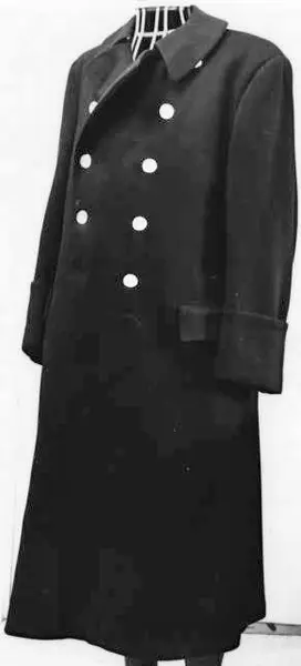 Kappa av mörkblått kläde med dubbla slag och svart yllefoder, två ytterfickor med lock, två rader uniformsknappar av största storleken, fem i varje rad, i ryggen dubbelslejf med två knappar, fällkrage, ärmarna har ett 140 mm brett uppslag. En knapp saknas.