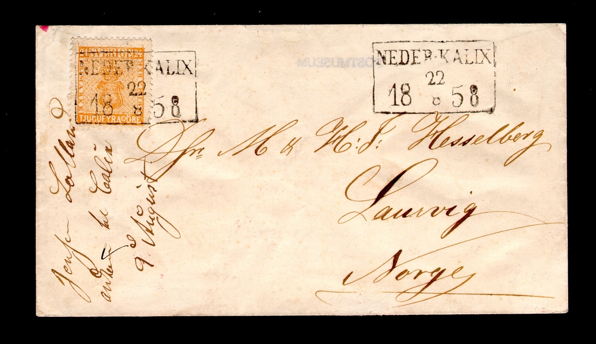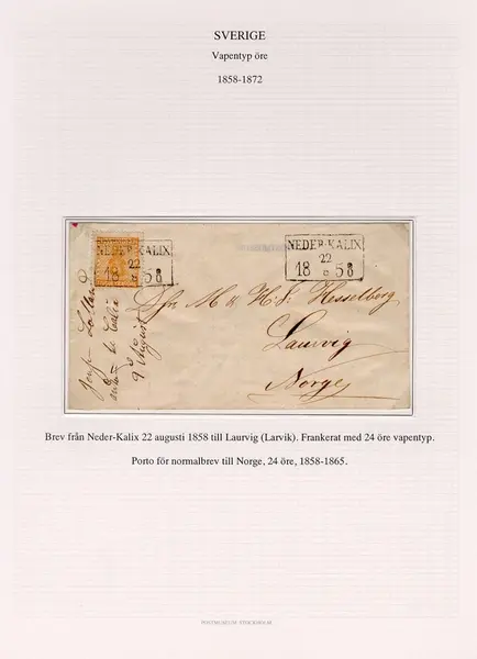 Brev från Neder-Kalix 22 augusti 1858 till Larvik (Laurvig), Norge. Frankerat med 24 öre vapentyp.
