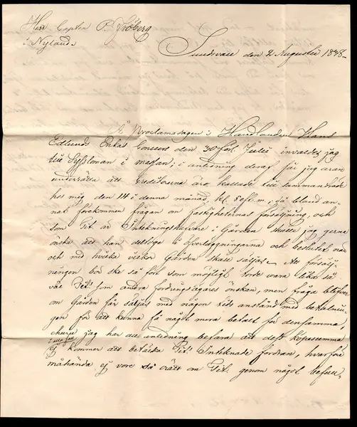 Text: Brev från Sundsvall den 3 augusti 1838 till Nyland