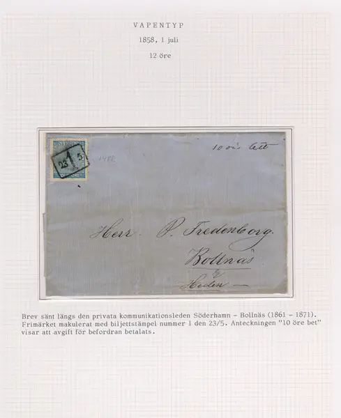 Text: Brev sänt längs den privata kommunikationsleden Söderhamn - Bollnäs (1861-1871). Frimärket makulerat med biljettstämpel nummer 1 den 23/5. Anteckningen "10 öre bet" visar att avgift för befordran betalats.