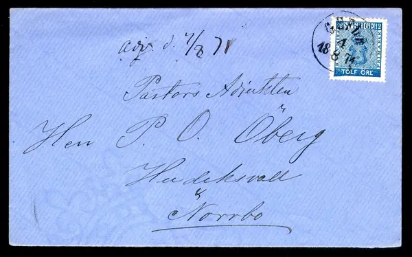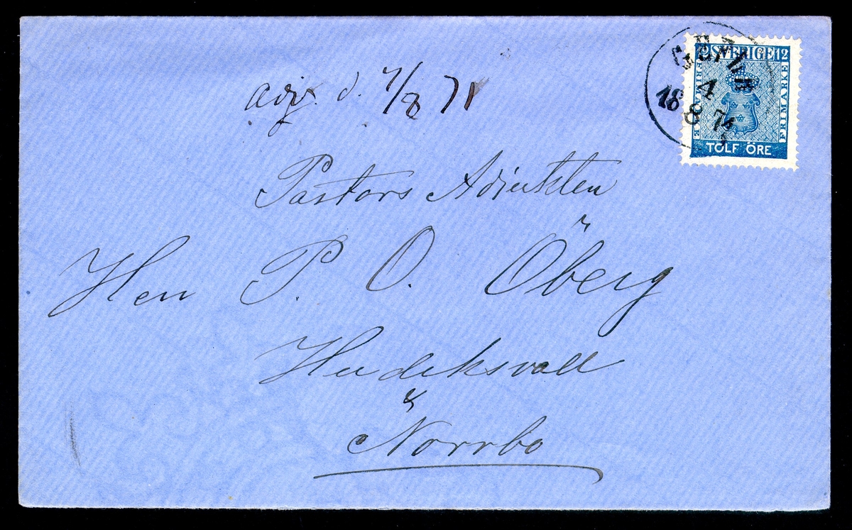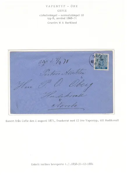 Text: Kuvert från Gefle den 4 augusti 1871, frankerat med 12 öreVapentyp, till Hudiksvall.