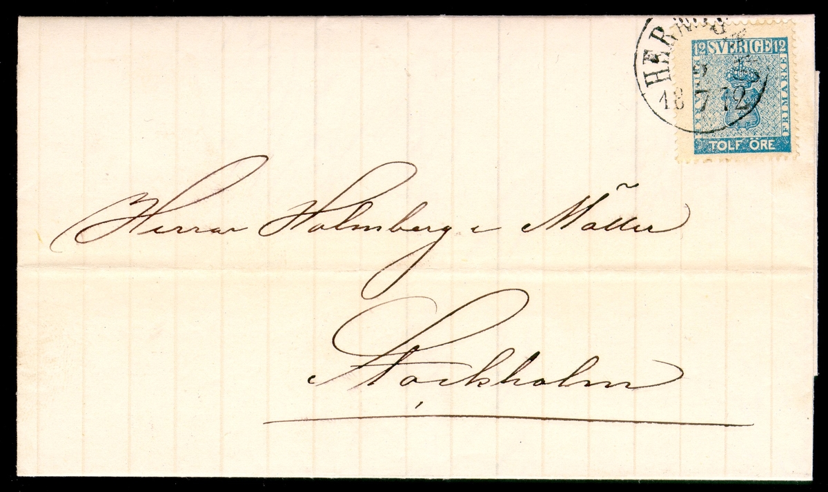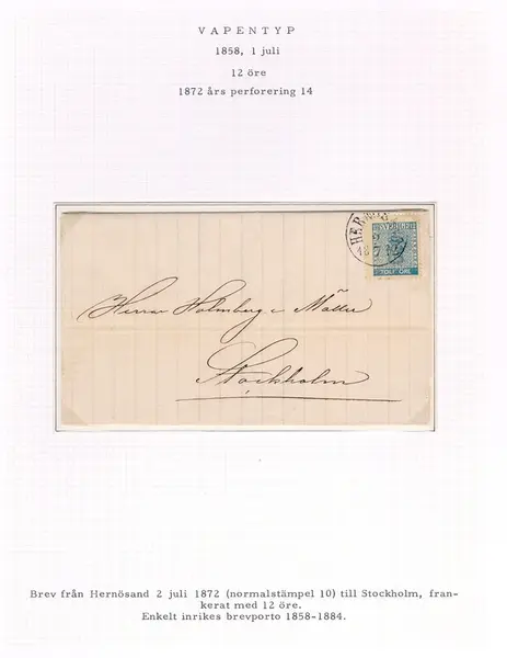 Stockholm, frankerat med 12 öre. Enkelt inrikes brevporto 1856-1884.