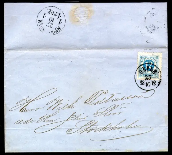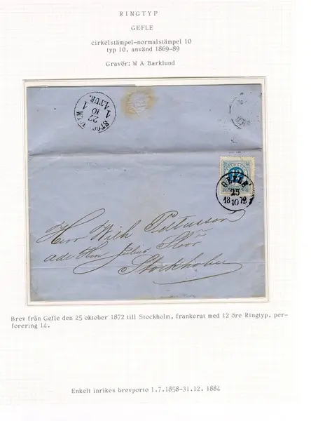 Text: Brev från Gefle den 25 oktober 1872 till Stockholm, frankeratmed 12 öre Ringtyp, perforering 14.