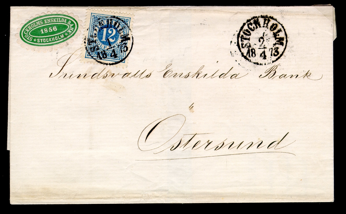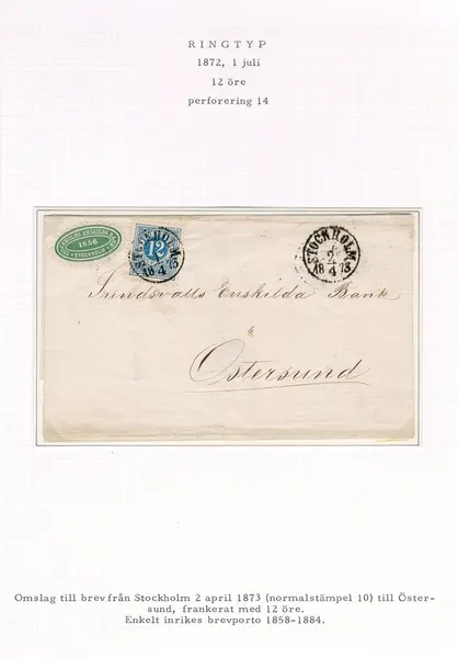 Text: Omslag till brev från Stockholm 2 april 1873 (normalstämpel10) till Östersund, frankerat med 12 öre. Enkelt inrikes brevporto1858-1884.