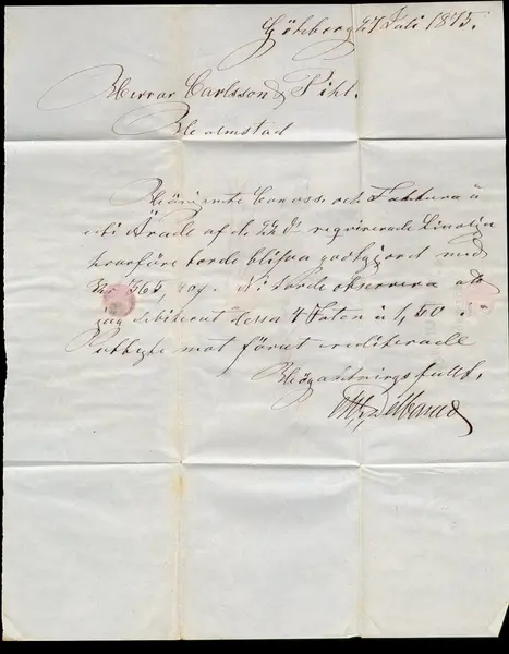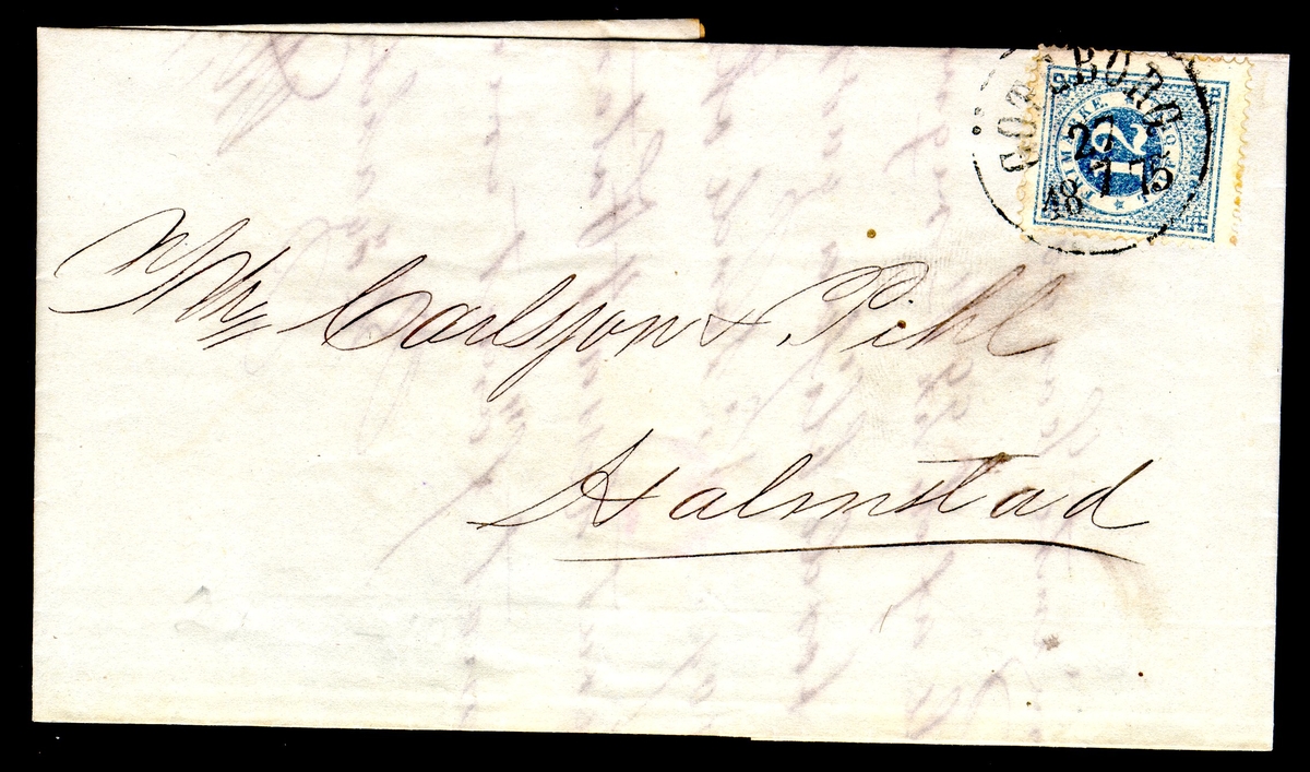 Text: Brev avsänt från Göteborg den 27 juli 1875 adresserat tillCarlsson & Pihl i Halmstad, frankerat med 12 öre Ringtyp, tandning 13