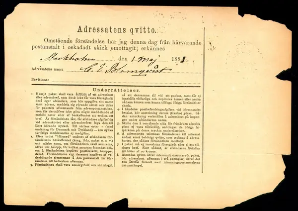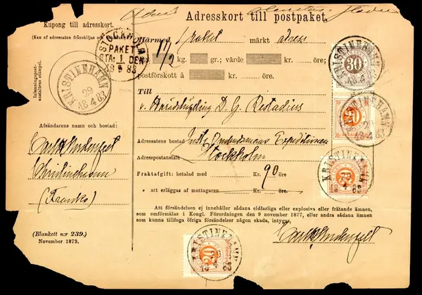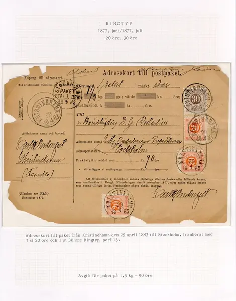 Text: Adresskort till paket från Kristinehamn den 29 april 1883