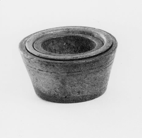 Viktsats med tre runda skålformiga insatsvikter som sätts i varandra. Vikterna är på 1, 1½ och 2 gram. Den största vikten är dekorerad med tunna linjer som löper runt om. Troligen hör de tre vikterna ursprungligen ej till samma viktsats. Något ärgade.