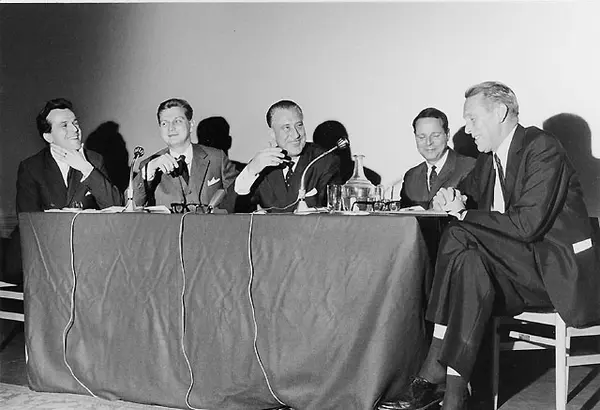 Deltagarna i estraddebatten var fr.v. docent Bertil Molde, chef för Institutet för svensk sråkvård, fil mag Hans Ingvar Hansson, Svenska Telegrambyrån -som skrivit de flesta av kapitlen i brevställaren - generaldirektör Nils Hörjel, produktsekreterare Arne Bohm och bankdirektör Erik Lindström. Den sistnämnde påpekade förenklingen i brevframställ-ningen, som inte får drivas för långt.
