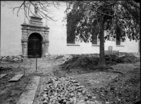 I sakristians västra fasad är en dörr med ett litet fönster.