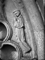 Dörren till pannrummet är rundbågig med kalkstensomfattning. Dörrbladet har snedställd panel och ett fönster.