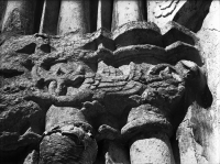 Portalerna (3 st.) är huggna av kalksten. Den södra tornportalen utgör kyrkans huvudingång. Kapitälbandet har i inre omfattningen stiliserade växtmotiv. Tornet har även en enkel, rundbågig portal åt norr. Korets portal har kapitälband som pryds av drakar och stiliserade växtmotiv, vilka dock är svårt vittringsskadade. Även tympanon pryds av stiliserade växtmotiv. Korportalen har en vimperg täckt av kalkstensskivor, tornets portaler saknar vimperger.