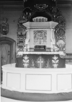 Altar/predikstolomfattning med medaljonger med olika figurativa bibliska motiv-10 st -infattade i vegeativa bladformer - allt som en portal. Målat och tillverkat av Olof Helsing från Gotland 1758. Oval, sluten altarring med enkla fyllningar, grå målning. Knäfall med grönsvart stänkmålning och delvis rött tyg. Högre trägolv inne i ringen, grå målning. Inte heller denna tillverkad för Lögdö ursprungligen.