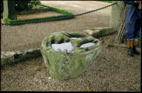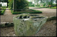 Dopfunten av sandsten är daterad till 1100-talet. På foten finns hörntappar i form av figurer, som föreställer ett lejon, en vädur och olika personer. Vilka dessa är har länge diskuterats, men en av figurerna påminner om Gumman Finn, som klänger runt en av kolonnerna i Lunds domkyrkas krypta. Personen på dopfunten bär dock skägg, och har därför ibland kallats för Jätten Finns lillebror. På cuppans sida finns ett lejonhuvud.