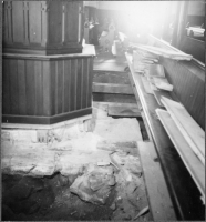 Under det andra fönstret från öster är kvaderstenar från en tidigare port lämnade synliga. Innanför dessa sitter ett större ventilgaller.