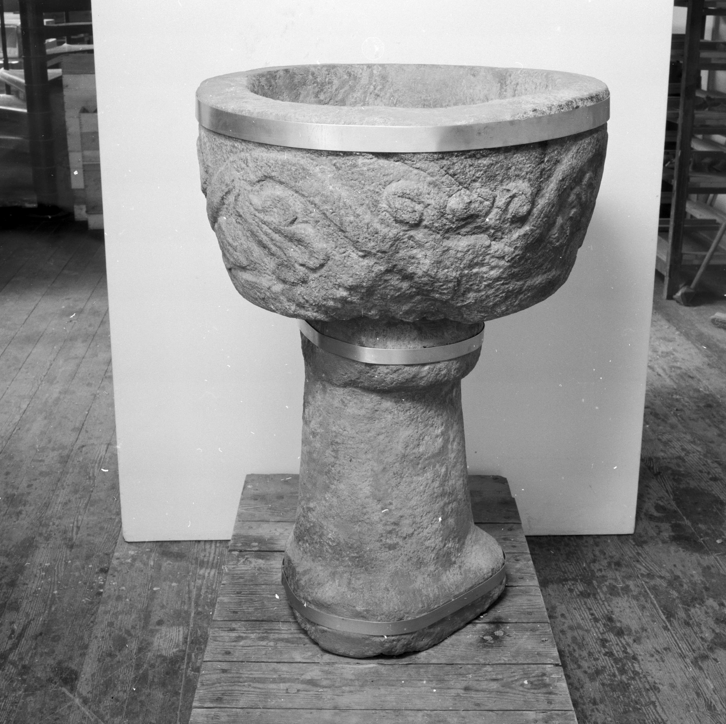 • Dopfunt, av glimmergnejs, 1200-tal, svårt skadad i branden, numera i nya kyrkan. Efter konservering.