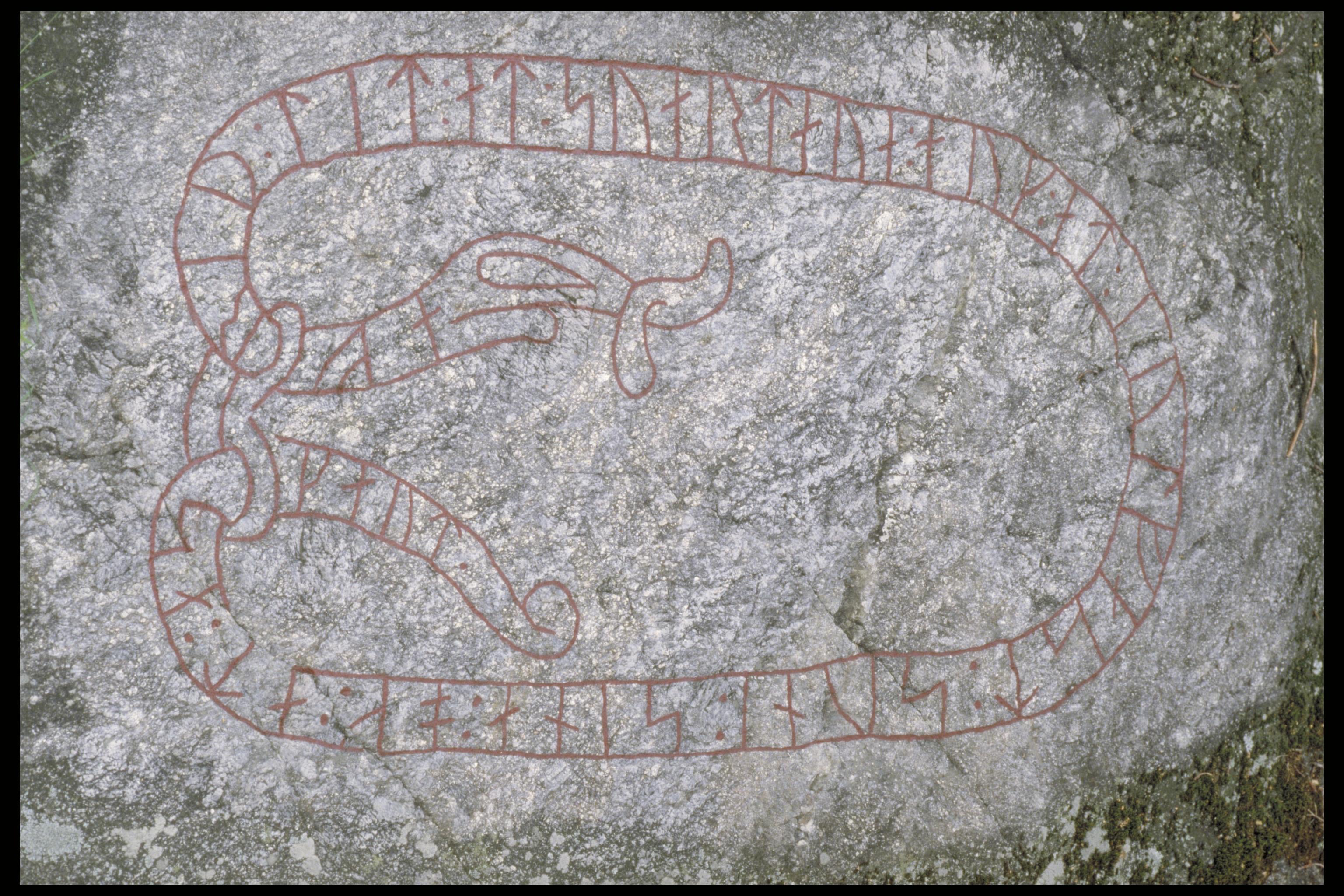 Inskriften på runhällen lyder: Åfrid lät (hugga hällen) efter Svarthövde och efter Igulfast, sina söner, och efter Åsgöt. Fotosyfte: Runskadeprojektet