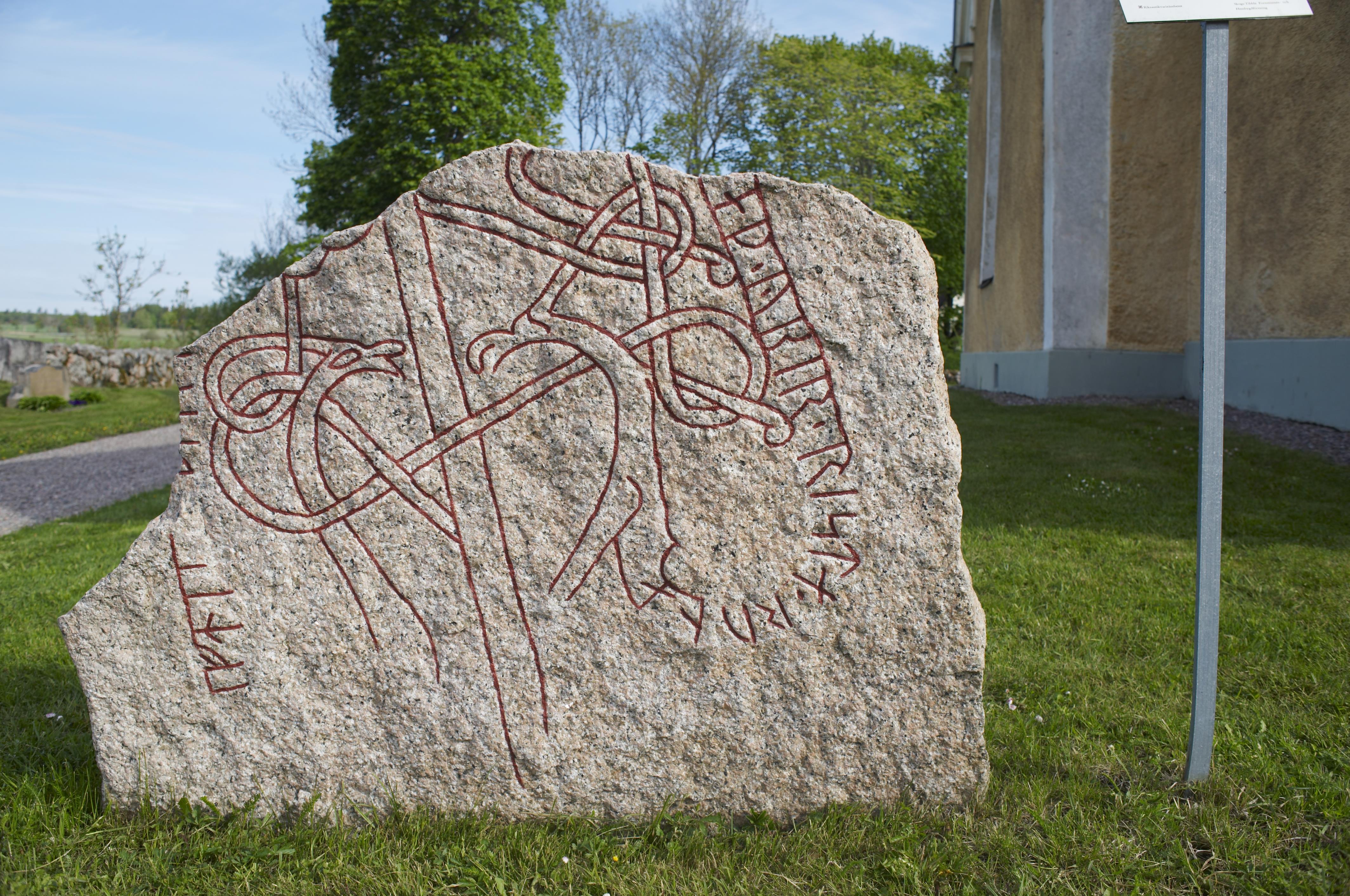 • Den starkt stympade runstenen påträffades 1938 under kyrkans golv med delar av den ursprungliga uppmålningen av ristningen bevarad. Av texten framgår det att en kvinna låtit rista stenen till minne av... Visa hela