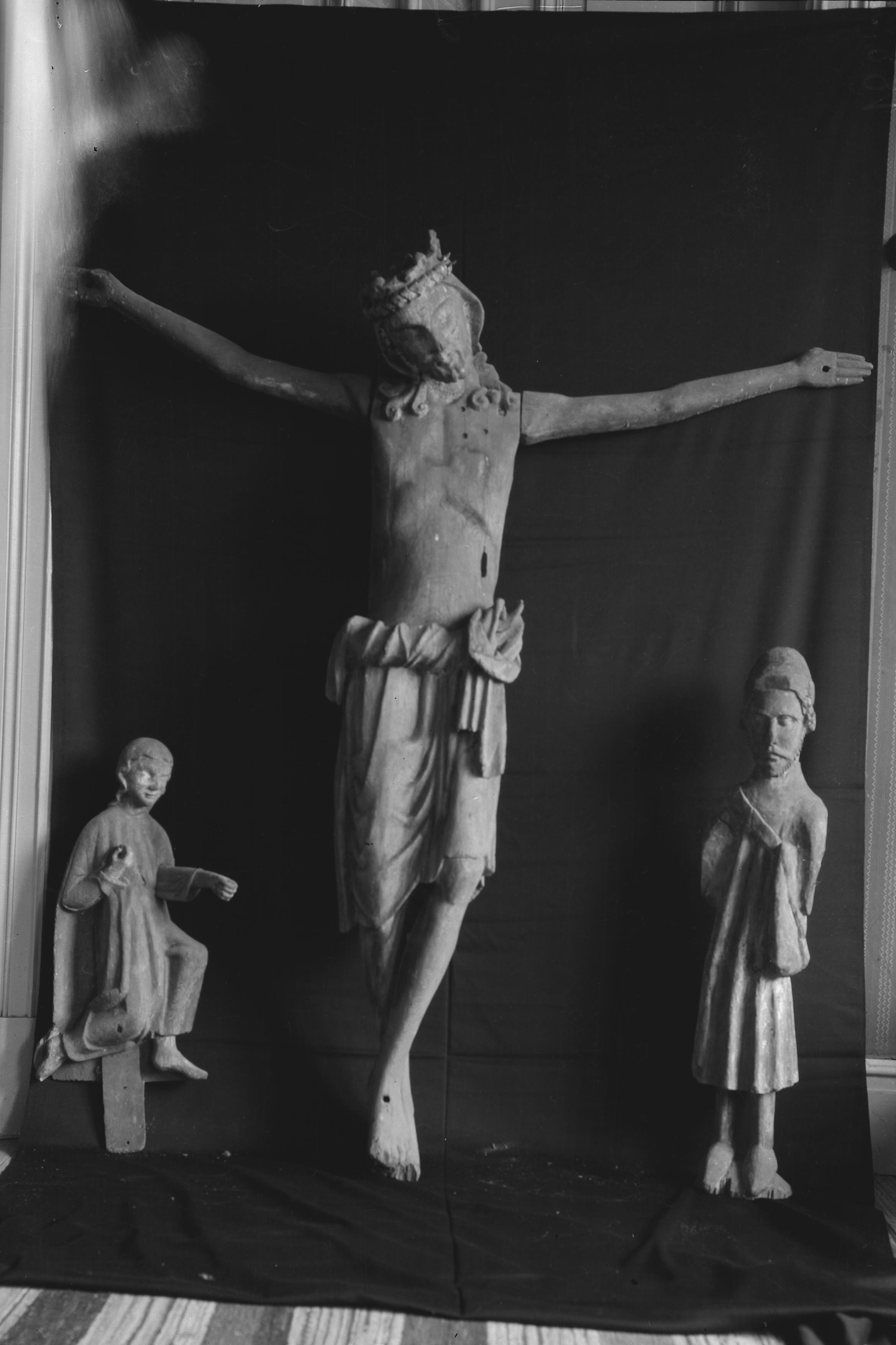 • Kristusfigur från kalvariegrupp, 1200-tal, flankerad av knäböjande ängel och stående manlig figur.