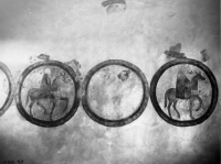 • Målning på kyrkans norra vägg, fjärde ringen från väster. Efter restaurering. Plåten trasig.