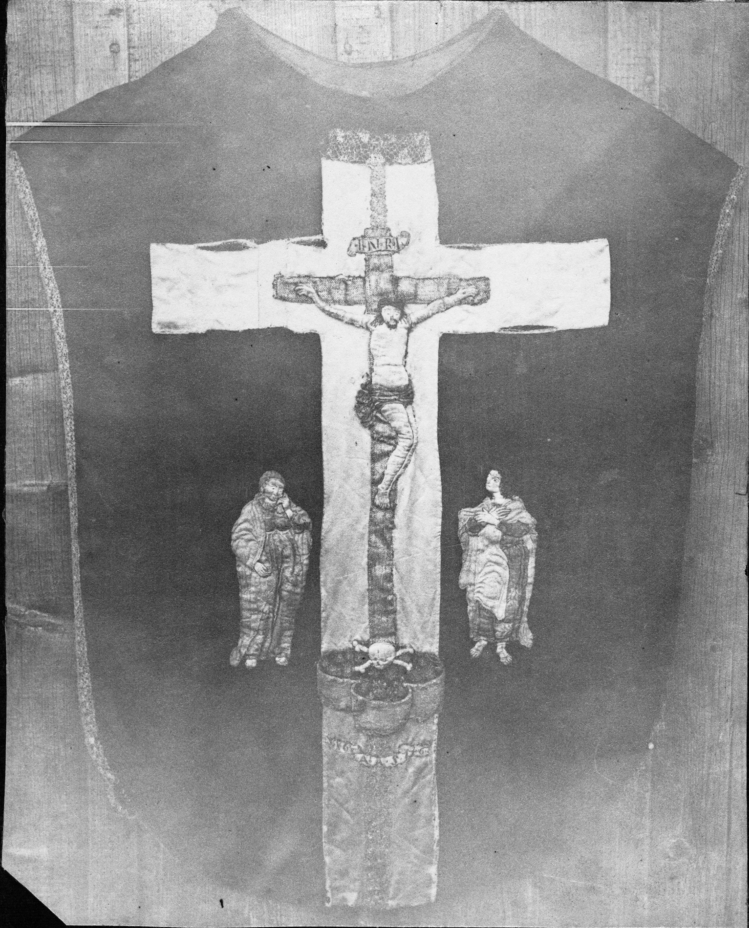• Mässhake, ryggstycke med dekoration i form av broderad kalvariegrupp.