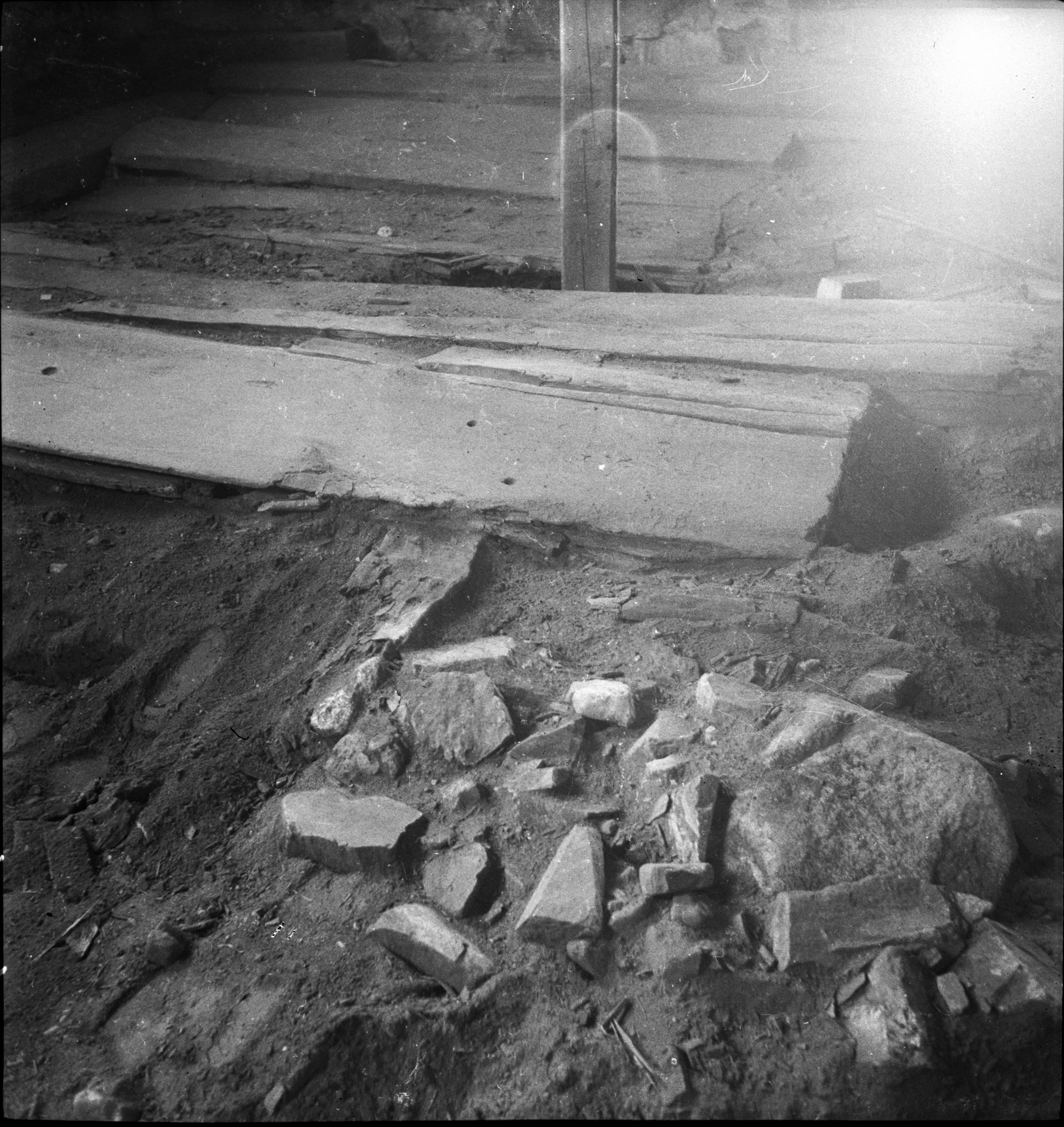 • Stenläggning och längsgående stock under tvärplankor.