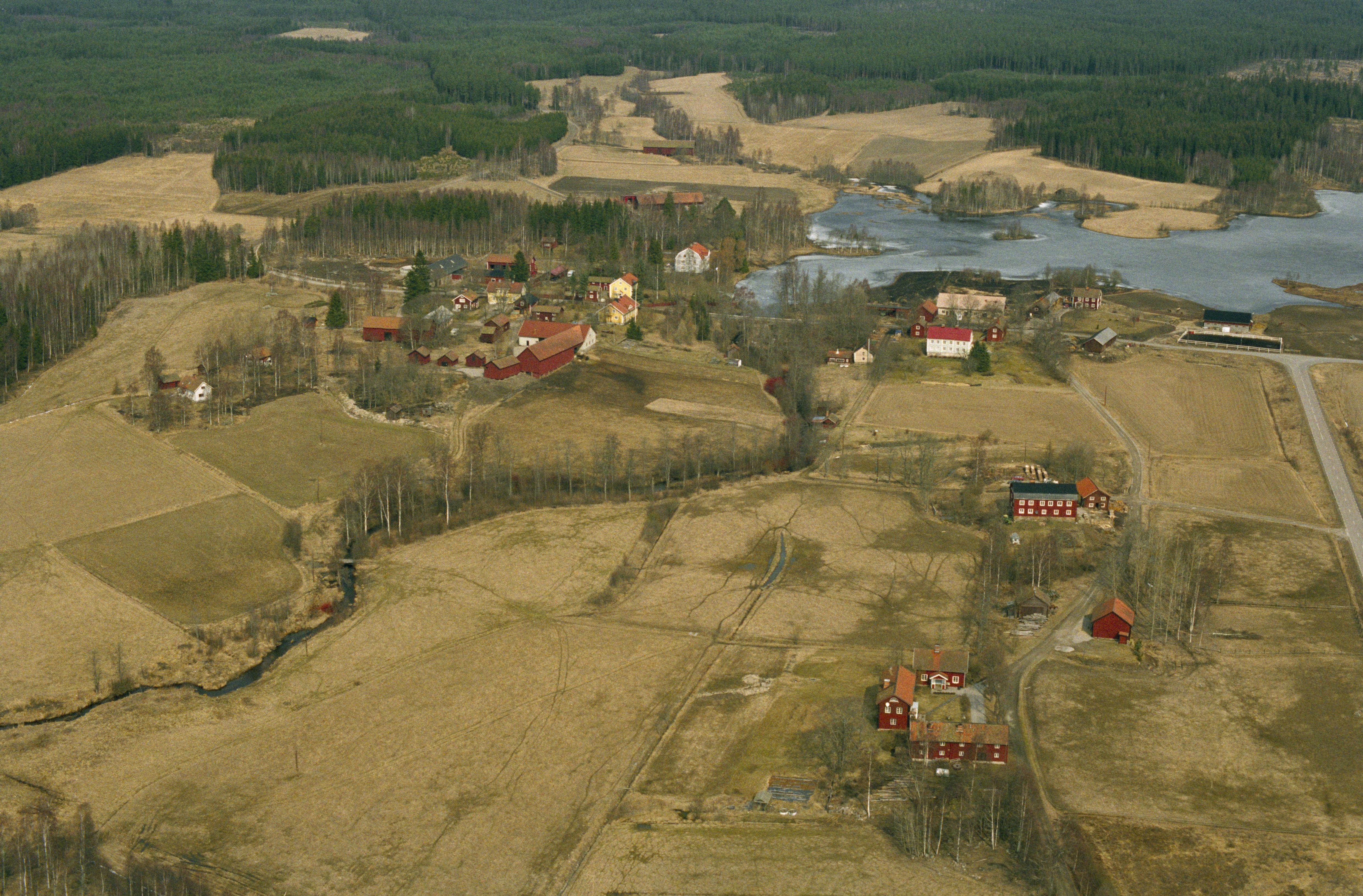 • Olsbennings by vid sjön Dammen i Svartåns dalgång. Vid bildens mitt hytt- och hammarområde RAÄnr Karbenning 27:1. Över bildens mitt hyttområde RAÄnr Karbenning 26:1-2. Bilden är tagen mot (väderstreck): N