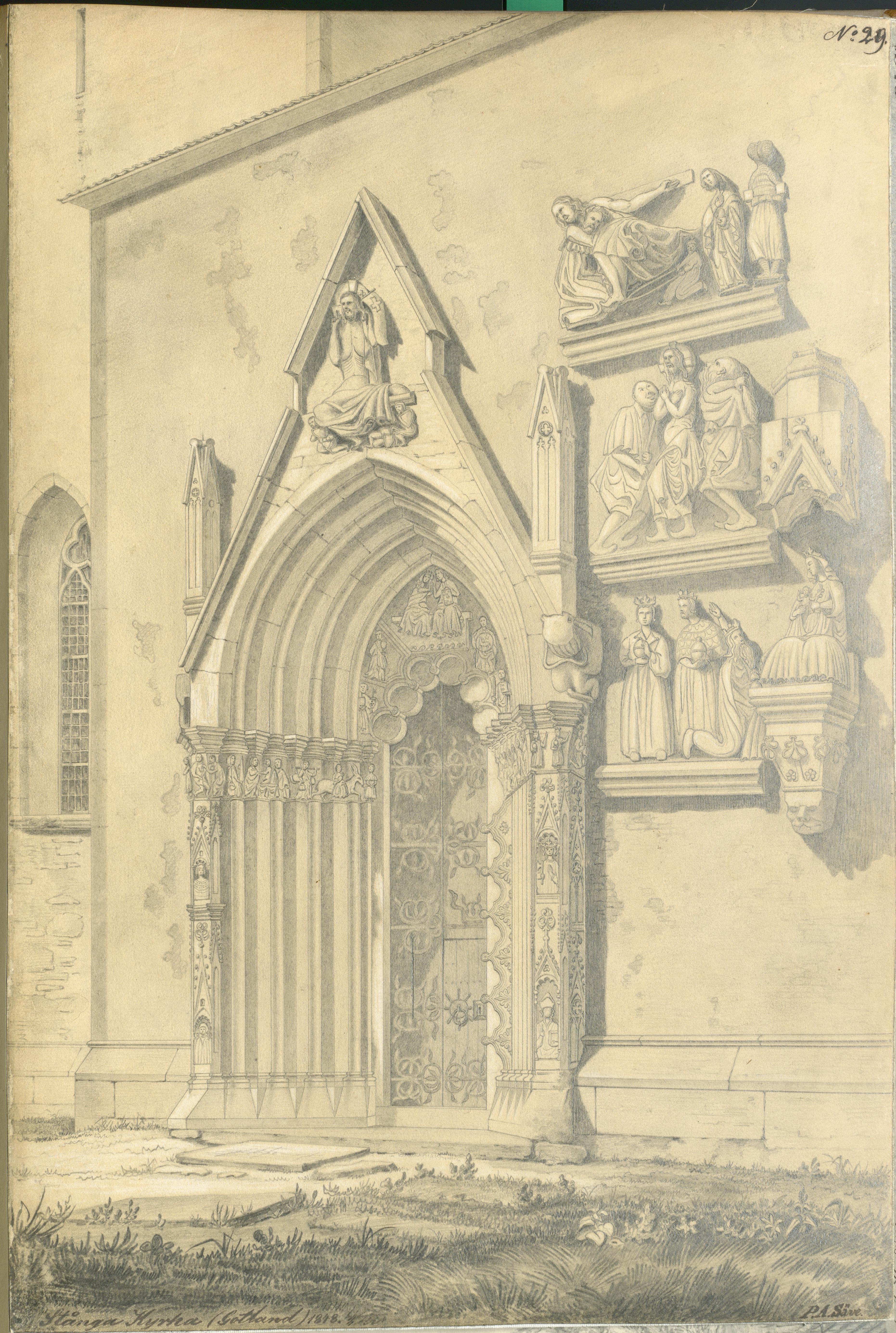 • Södra långhusportalen. Teckning av Per Arvid Säve 1848