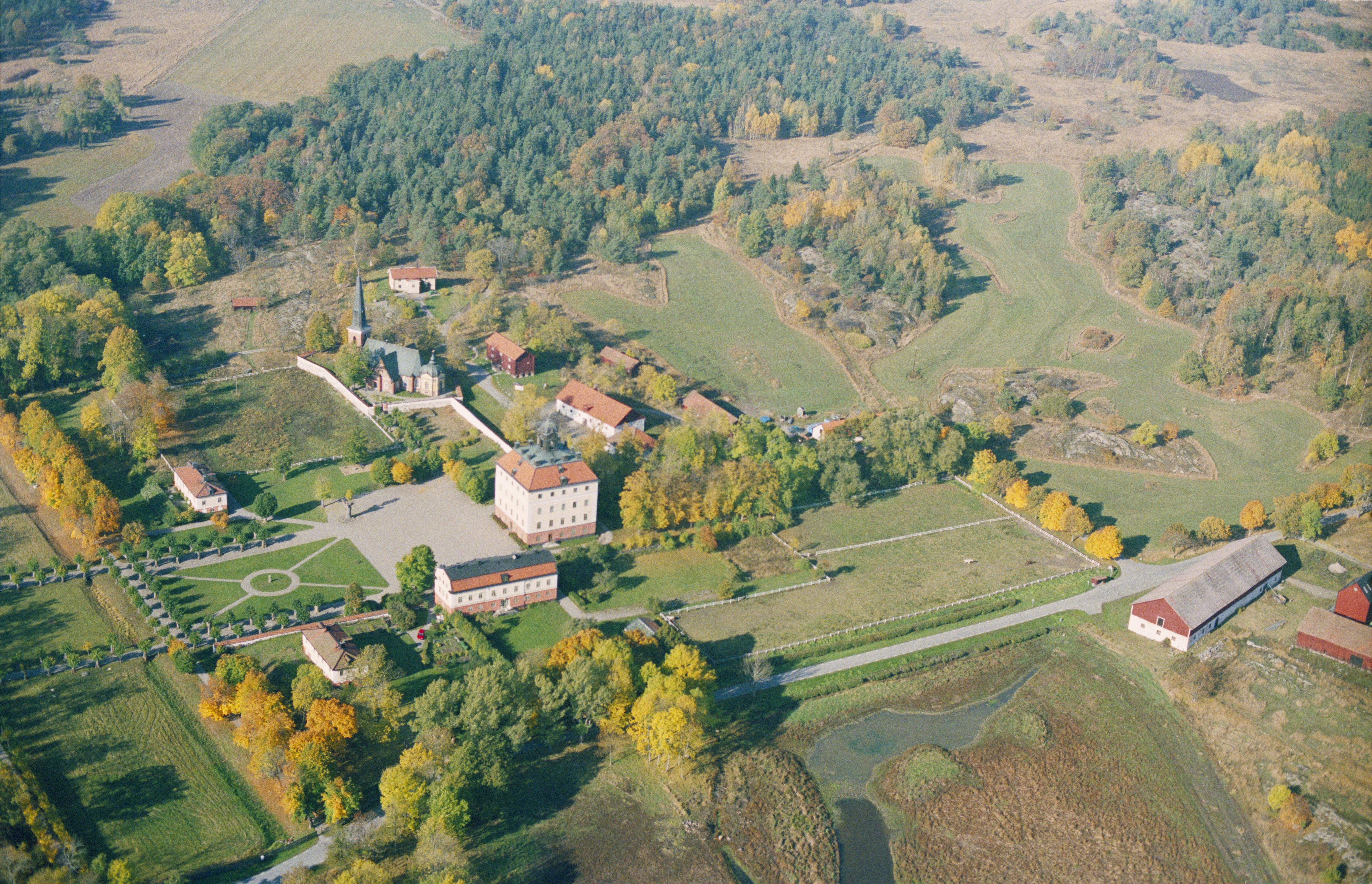 Ängsön och Ängsö naturrreservat vid Granfjärden i Mälaren. Ängsö kyrka och byggnadsminnet Ängsö slott i slottstomt RAÄnr Ängsö 4:1. Bilden är tagen mot (väderstreck): NNV Fotosyfte: Flygbildsdokumentation