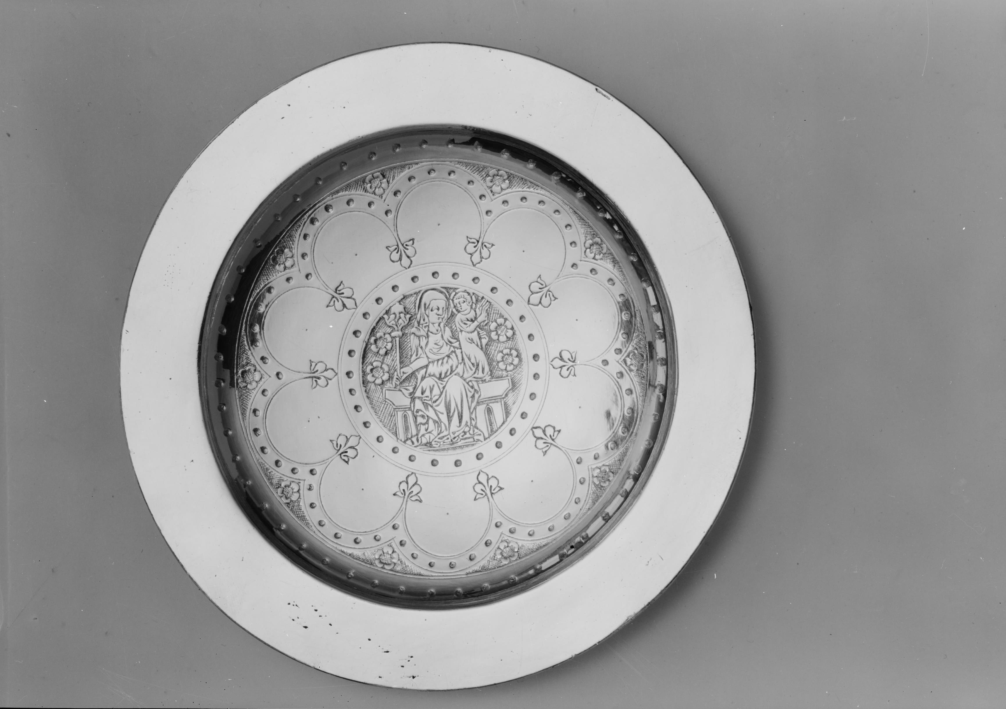 • Patén av silver, förgylld. I mitten graverad framställning av Maria med barnet och rosor inom sex-passformad ram. Omkring 1300. Snabbinv.
