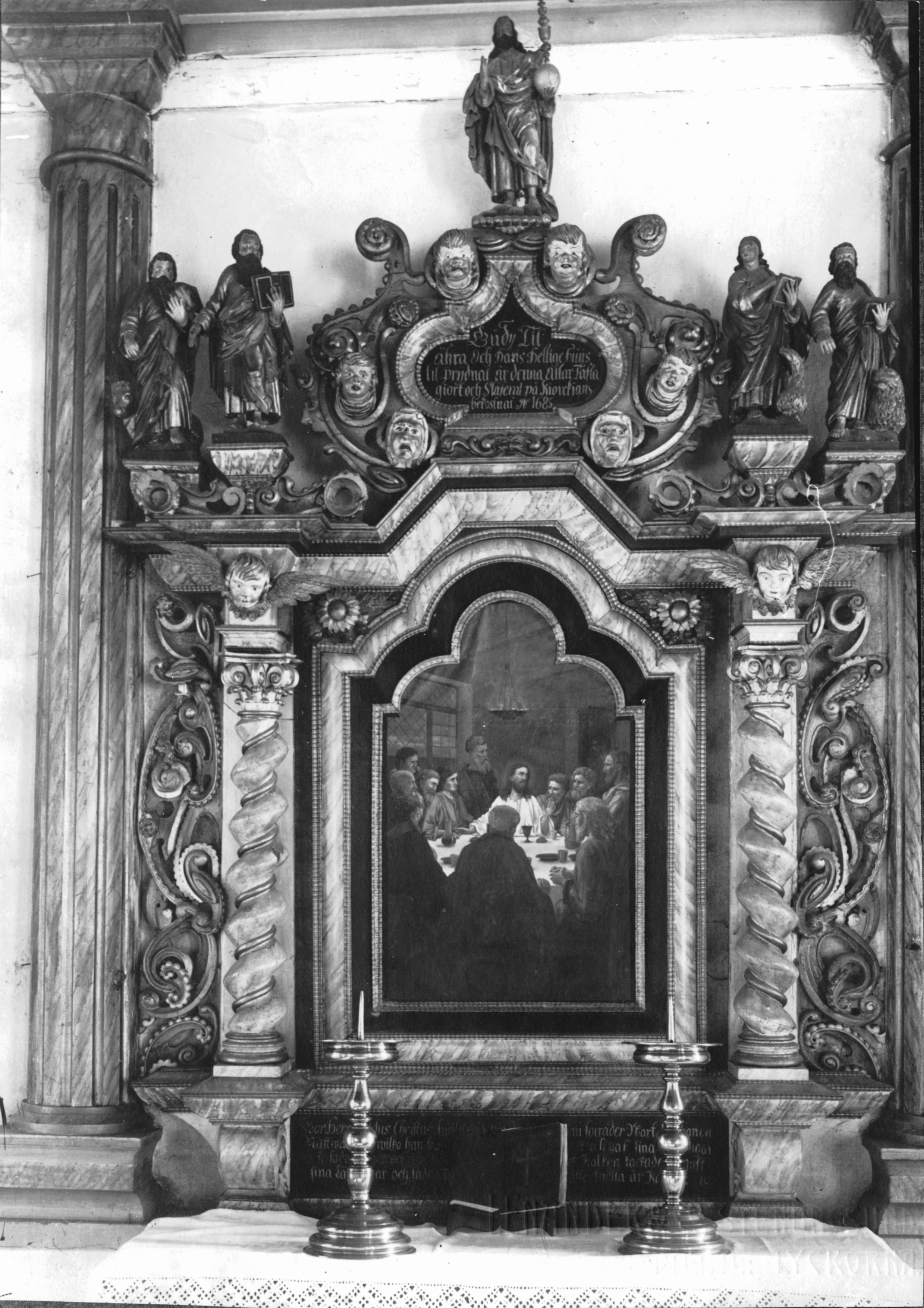 • Pelarna före konserveringen. Altaret tillhörde den nedbrunna kyrkan.