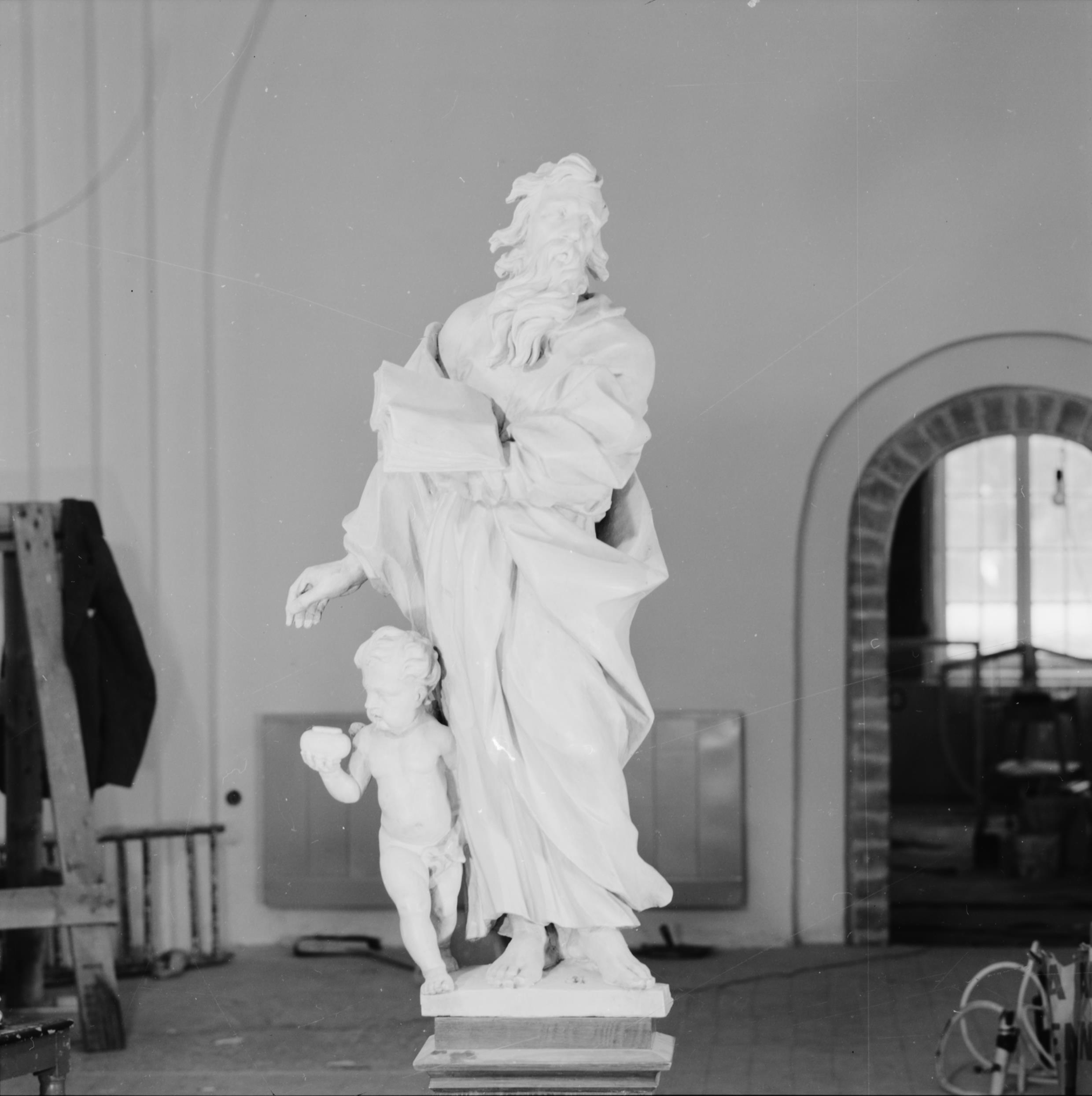 • Skulptur av evangelist. Tros vara skapad av Caspar Schröder. Av trä och vitmålad. Snabbinv.