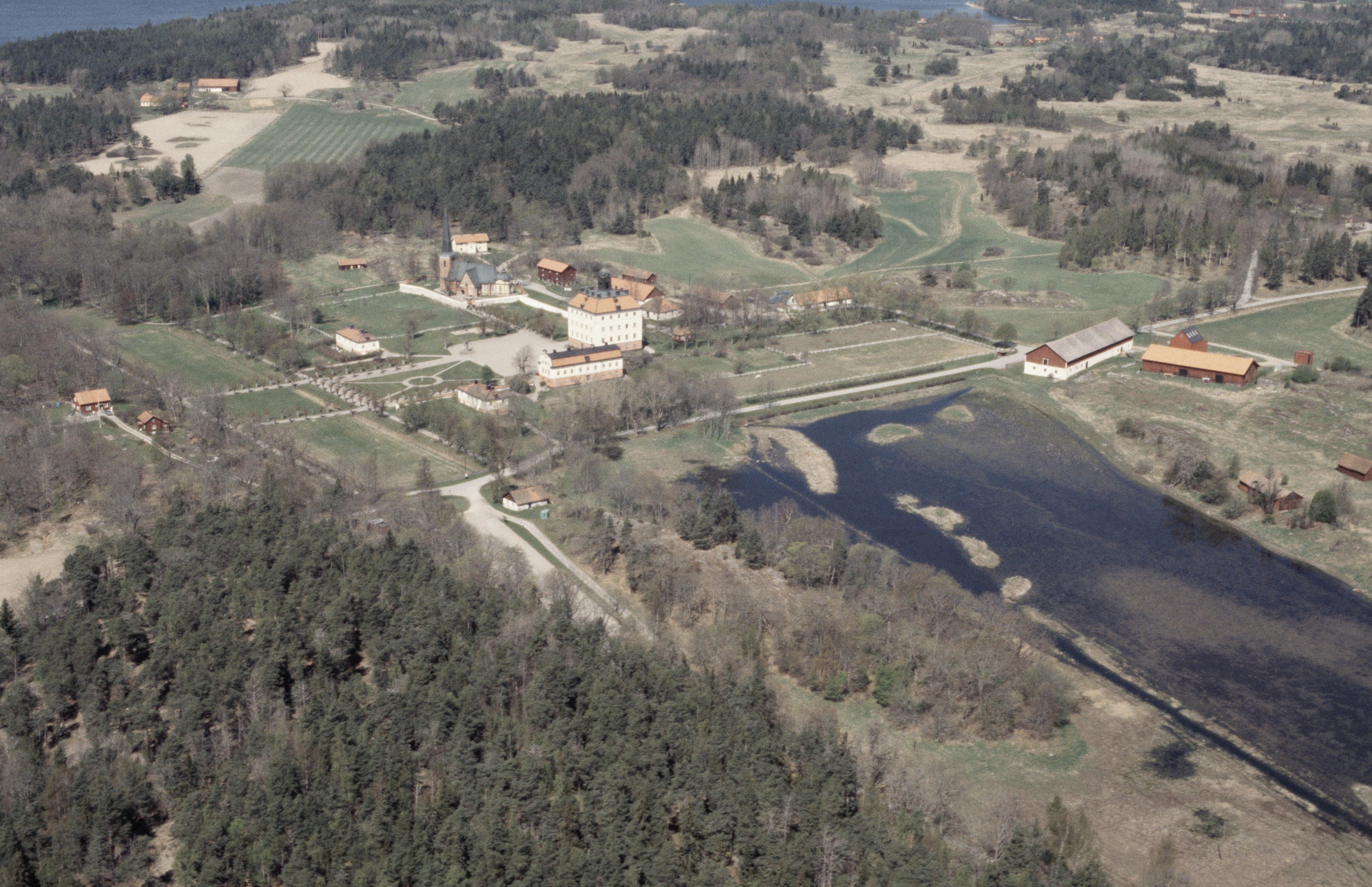 Ängsön och Ängsö naturrreservat vid Granfjärden i Mälaren. Till vänster över bildens mitt Ängsö kyrka och byggnadsminnet Ängsö slott i slottstomt RAÄnr Ängsö 4:1. Bilden är tagen mot (väderstreck): NNV Fotosyfte: Flygbildsdokumentation