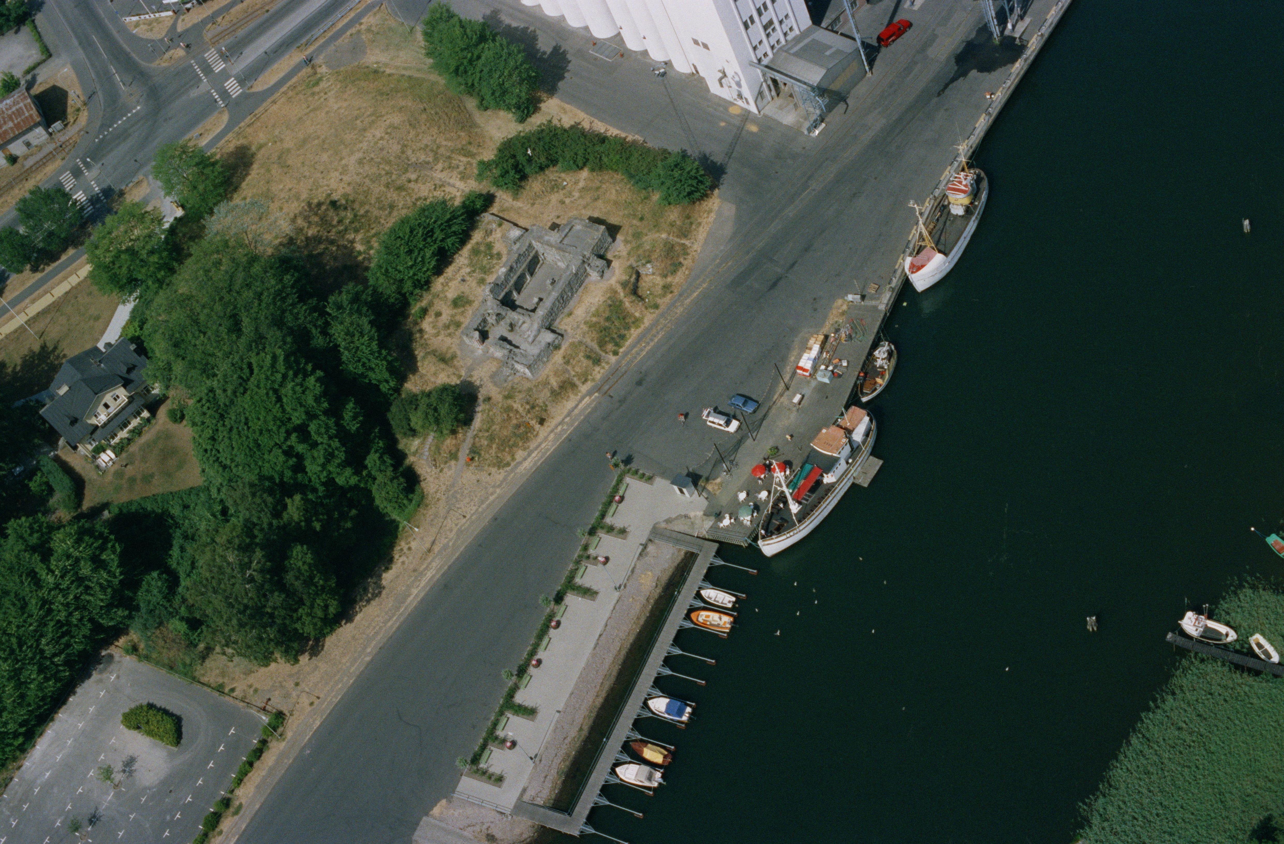 Helge å i staden Åhus. Biskopsborgen Aasehus (borgruin) RAÄnr Åhus 14:1. Bilden är tagen mot (väderstreck): NO Fotosyfte: Flygbildsdokumentation